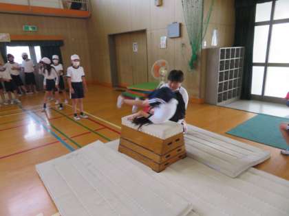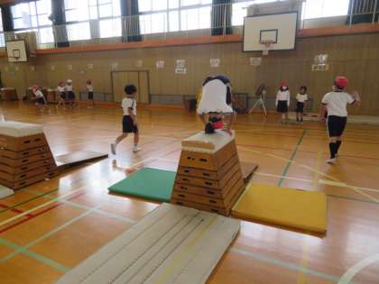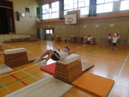 跳び箱の高さや向きを変えたり、担任の補助があったりといろいろな場で安全面に注意しながらチャレンジしていました。