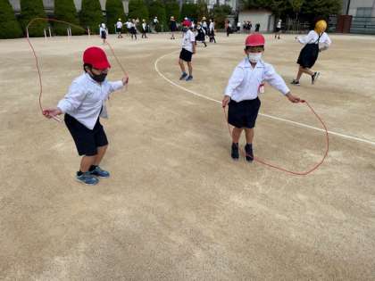 運動会の賞品でいただいた跳び縄で縄跳びをする子どももいます。