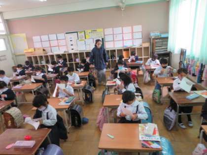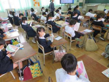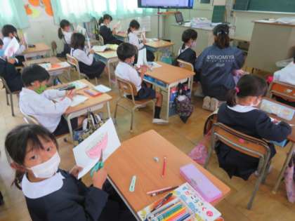 「ことばあそびうたをつくろう」の学習で、食べ物の絵を描き、はさみを上手に使って切り抜いていました。