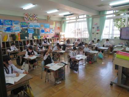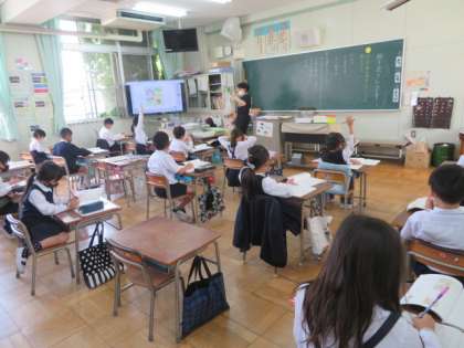 「絵を見てお話を書こう」で、一、二、三の場めんのようすを考えることをめあてに学習していました。