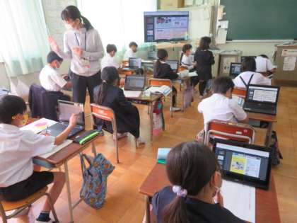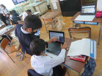 「パラリンピックが目指すもの」で、パラリンピックのリーフレットを作ることわ目的に、学習用個人端末で自分が選んだ競技について調べていました。