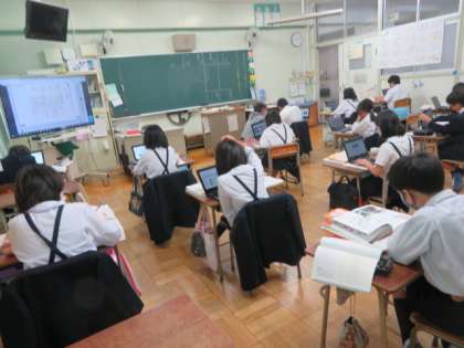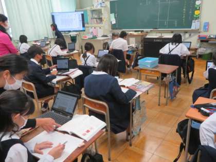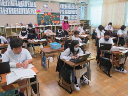 「和の文化について調べよう」で、パンフレットの構成を考えようをめあてとして、調べながらワークシートにパンフレットの概要をまとめていました。