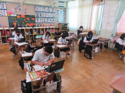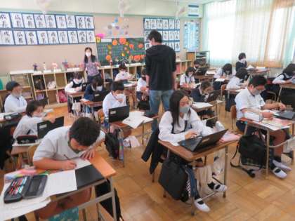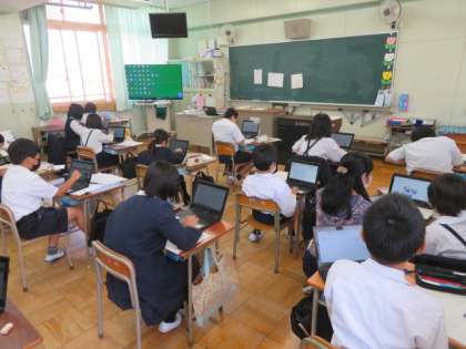 「和の文化を受けつぐ」の学習で、学習用端末で調べたり、その他の資料を使ったりしながらパンフレットづくりを進めていました。