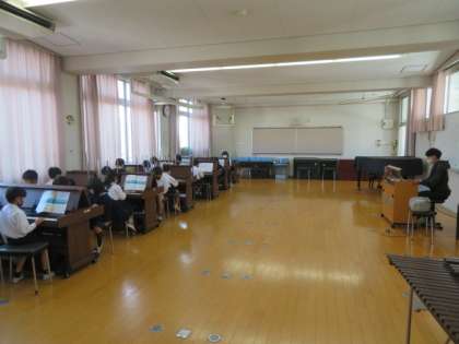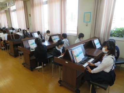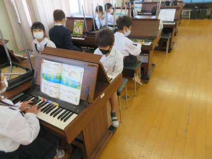 音楽室のオルガンを使い、「かえるの歌」などを弾いて指と鍵盤の関係を確かめていました。