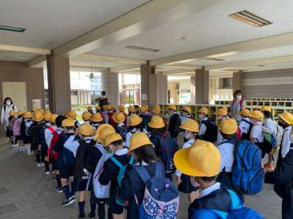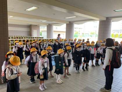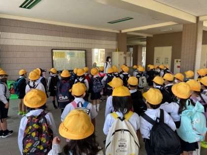 ピロテイに集合しました。先生の話をしっかりと聴いています。