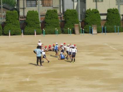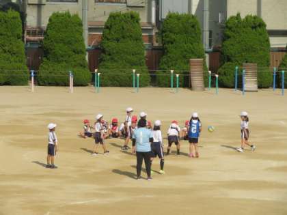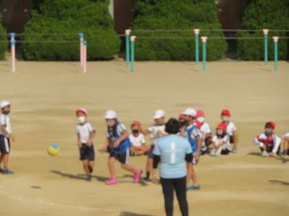 チーム対抗で、ボールを使ったパスゲームに取り組もうとしていました。