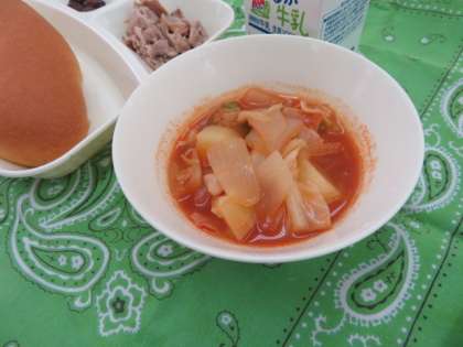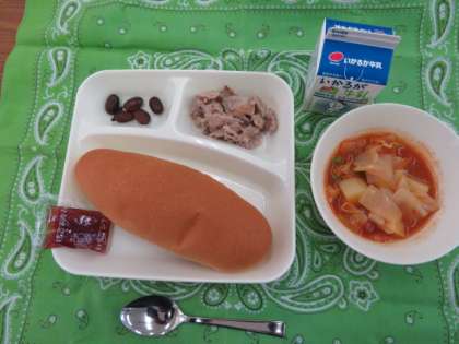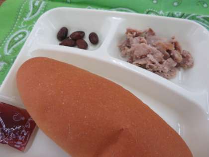 献立は、豚肉のガーリック焼き、ケチャップ煮、うずら豆のグラッセ、いちごジャム、コッペパン、牛乳でした。