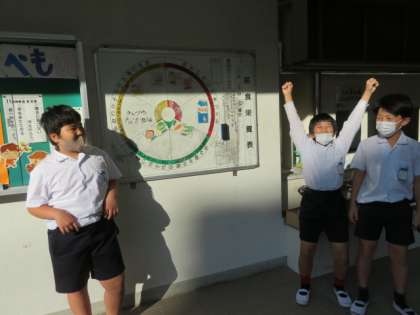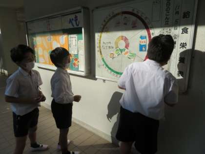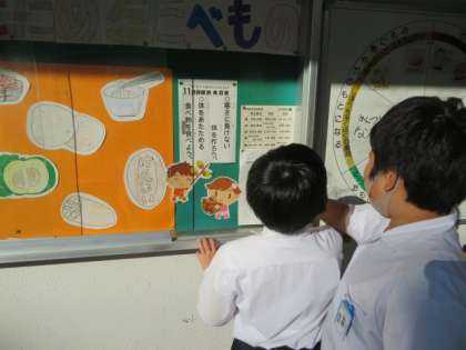 各曜日ごとに当番が決まっており、給食室前の給食掲示板の書き換えを給食委員会担当児童が行っています。