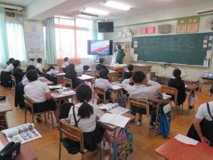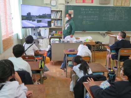 大型モニターの資料映像を鑑賞しながら、実際の川でも流れる場所によって川のようすにちがいがあるのかという課題に取り組んでいました。
