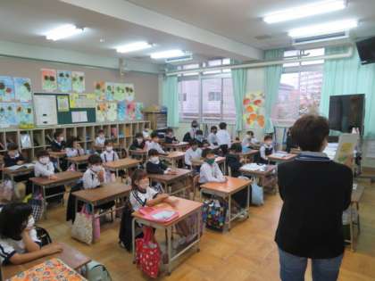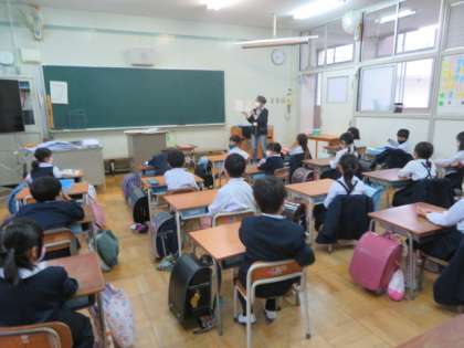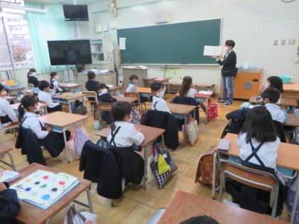 読書タイムの時間を使って、図書館補助員による朝の読み聞かせが1年1組で行われました。