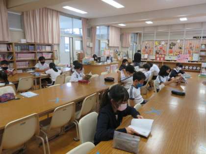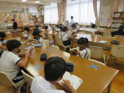 借りた本の返却と借りる本の貸し出しの手続きを行い、時間がある子どもたちは自由読書をしています。