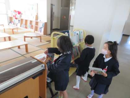登校してきた児童は、心の天気をタブレット端末や学習用端末で打ち込み、8時30分からの読書タイムに向けて本を選んだりしています。
