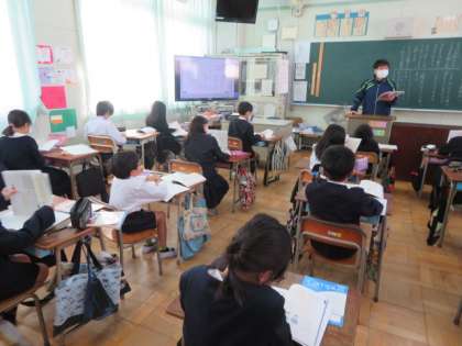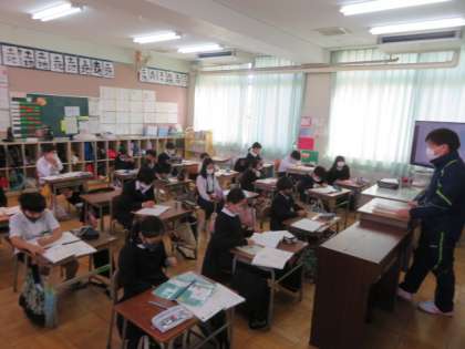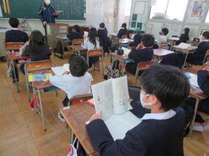 「聞いてほしいな 心に残っている出来事」で、教科書の例文を参考にしながら、自分の心に残っている出来事を書くためにワークシートを使って要旨をまとめていました。