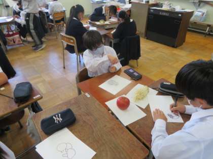 「秋の味覚」をテーマに野菜をフェルトペンで線描していました。