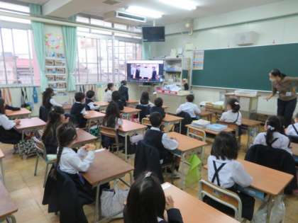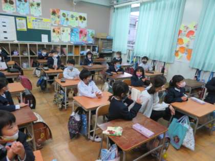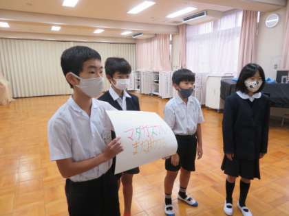 多目的室から集会委員会担当児童による「早口言葉」が提示され、各学級では出席番号で指名された子どもが早口言葉を唱えていました。