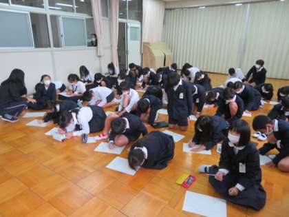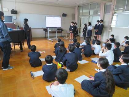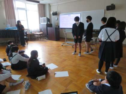「世界の子どもたち」について、学校・戦争・食糧事情、健康、水事情の5つの観点からインターネット等で調べた資料をパワーポイントで示して発表会をしていました。