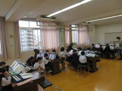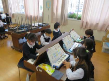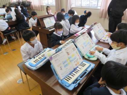 音楽室で曲のメロディーに合わせて、鍵盤ハーモニカの鍵盤を押さえることを確かめていました。
