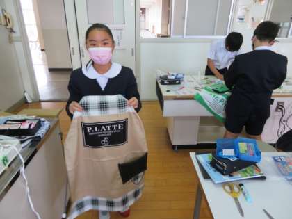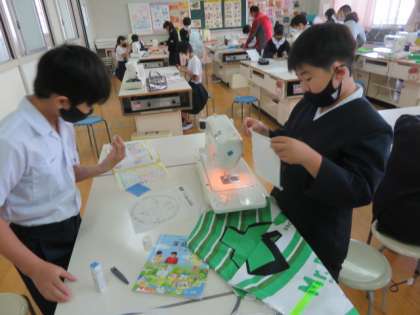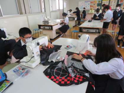 ミシン縫いの実習で、エプロン作りに取り組んでいます。