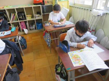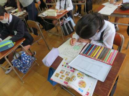 アルファベット順で線を引いて絵を完成させたり、英語で表記された色を塗る塗り絵を完成させたりして英語のアルファベットや言葉に親しみながら活動をしていました。