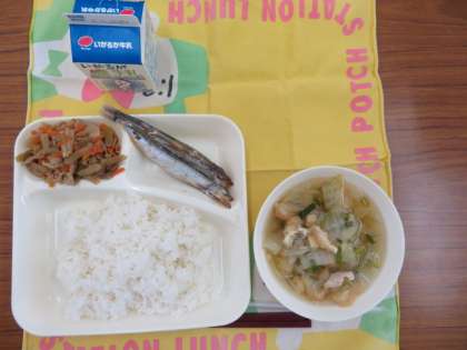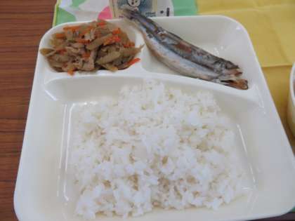 献立は、焼きししゃも、五目汁、きんぴらごぼう、ごはん、牛乳でした。