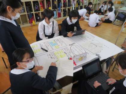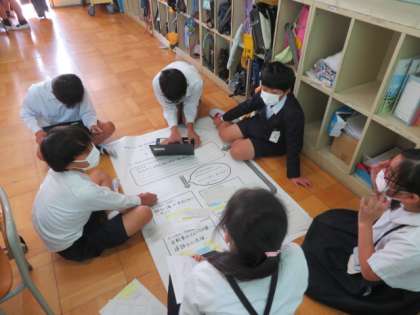 「町の幸福論」の学習で、1組教室では、「商店街」と「河川敷」のコミュニティデザインについてまとめていました。
