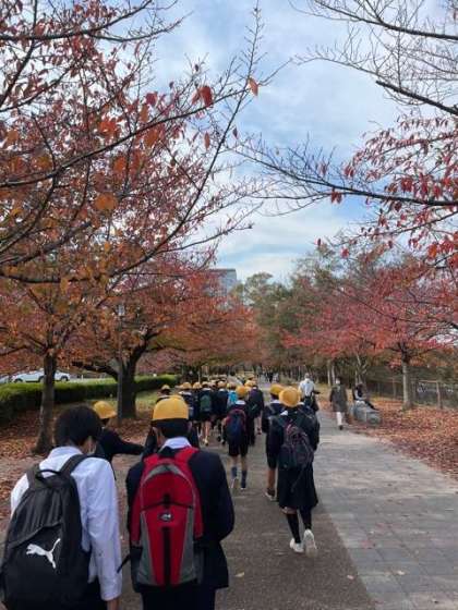 12:00 公園内の紅葉を愛でながら、教育塔横を通っています。