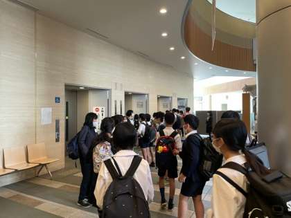 13:38 8人ずつエレベーターで10階まで上がって館内を見学をします