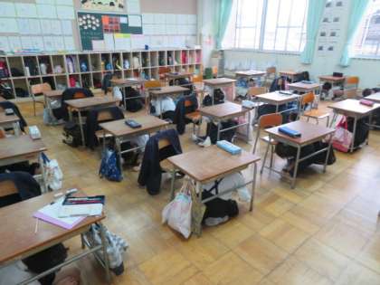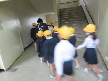 まずは、机の下に頭を抱えて避難し、地震の揺れがおさまってから運動場へ向けて避難します。(雨天なので、ピロティに向けて避難しました)