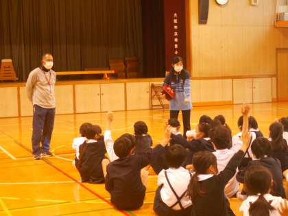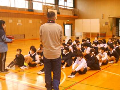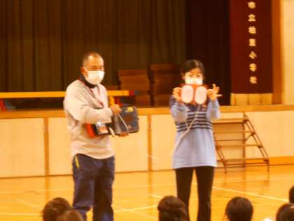 5年生は、あっぱくんを使った心肺蘇生体験をしたり、AED蘇生動画を視聴したりした後、実際のAEDについて原物を観ながら、その使い方等について説明を受けていました。