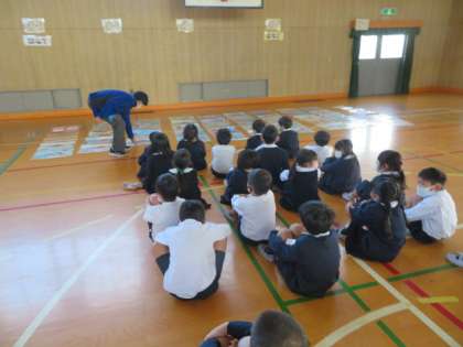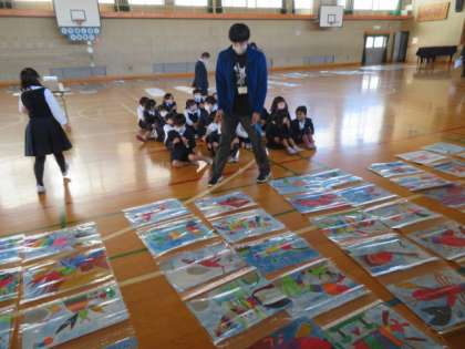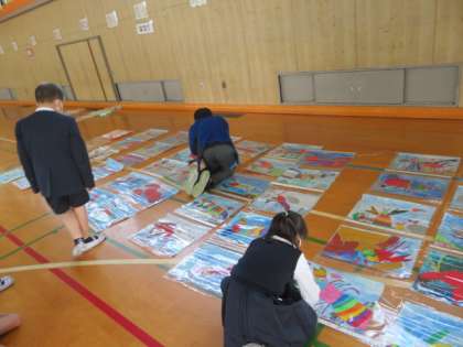 講堂で作品展の作品を掲示するために自分が描いた絵をもってきていました。
