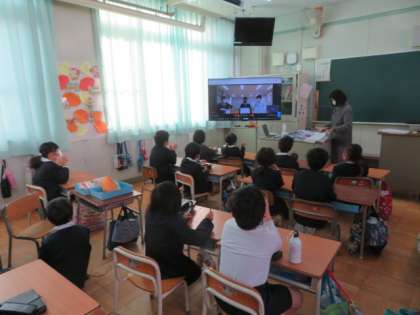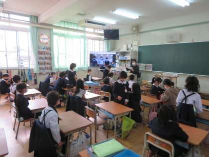 多目的室から全学級にミートを使って流されました。