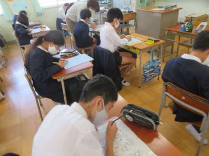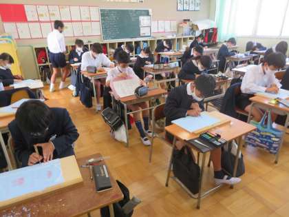 下絵を版木に写し取り、彫刻刀で削り始めている児童もいました。