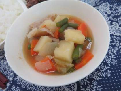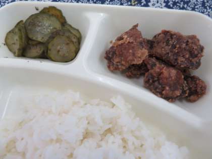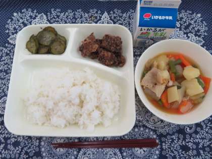 献立は、くじらの竜田揚げ、豚肉とじゃがいもの煮物、きゅうりの赤じそ和え、ごはん、牛乳でした。