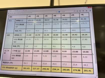 13:20 ガス、水、などの使用量が、班ごとに示されています。