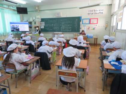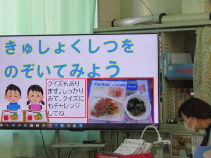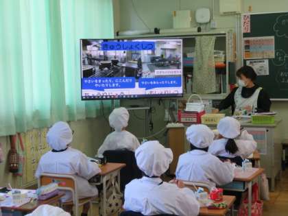 「2021 きゅうしょくしつをのぞいてみよう」という映像をみながら給食をたべました。給食室で働いている方や給食室のひみつがいろいろわかりました。
