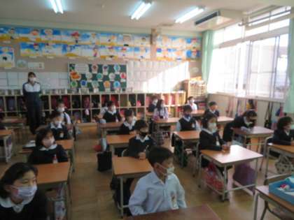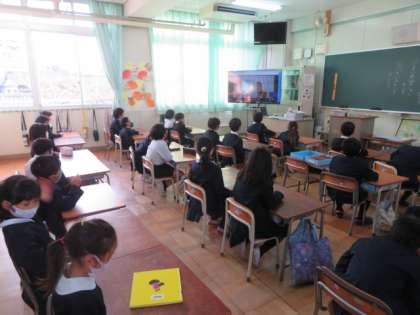 12月初めての児童朝会もグーグルミートを使い、多目的室から全教室へ映像を配信する形で行いました。