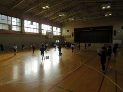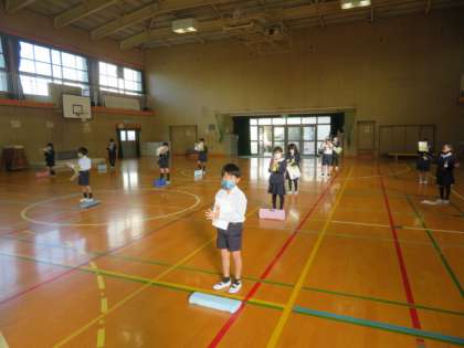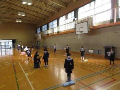 講堂いっぱいに広がりディスタンスをとって、音楽の学習をしていました。