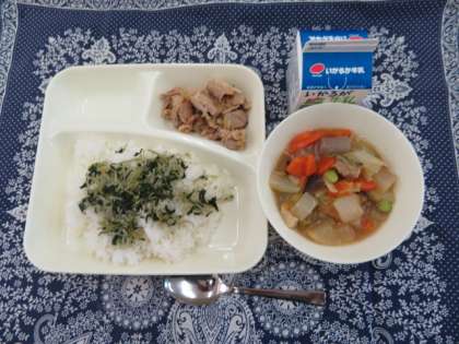 献立は、じゃこ菜っ葉ごはん、豚肉のスタミナ焼き、厚揚げと冬野菜のあったか煮、ごはん、牛乳でした。