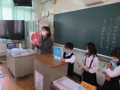 「むかしばなしをたのしもう」の学習のまとめとして、自分が選んだ昔話の本を紹介していました。