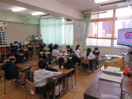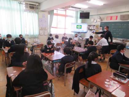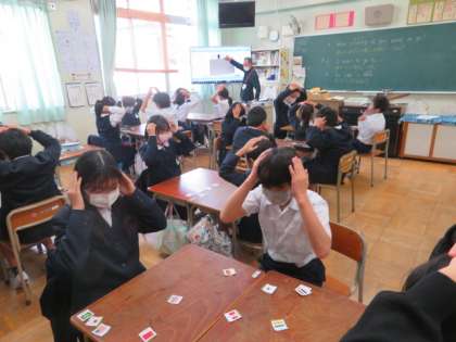 大型モニターからのネィティブ音声(国名)を聴き取り、カルタ形式で国旗カードを取り合い大いに盛り上がっていました。