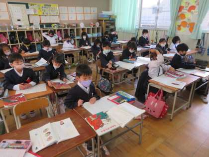 「むかしばなしをたのしもう」の学習で、ワークシートに記入しながら、もとのおはなしから各自がそれぞれにおはなしをつくる活動をしていました。
