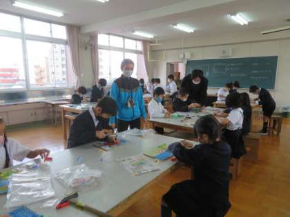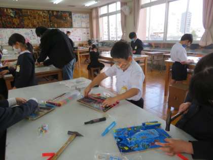 板に金づちで釘を打つことをねらいとした木工作品作りに取り組んでいました。