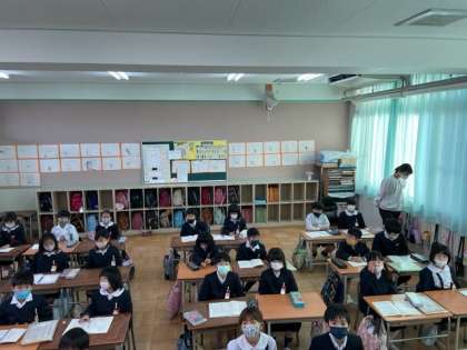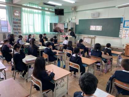各教室では、教室のスピーカーの方を見て校長、看護当番の先生からの話をしっかりと聴いていました。
