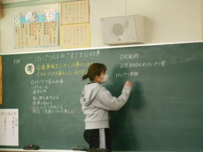 「けいさつしょのさまざまな仕事」について、交通事故をふせぐ仕事のほかにどのような仕事をしているのだろうというめあてをもって、調べながらまとめていました。