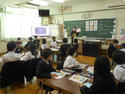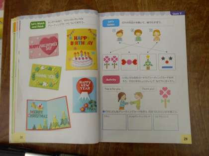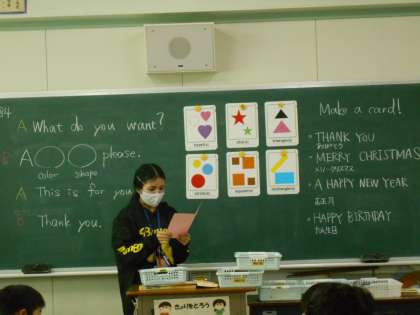 「ありがとう」「メリークリスマス」「お正月」「お誕生日」などの英語のメッセージカードを「相手」と「どんなカードを渡すか」考えて作成しようとしていました。