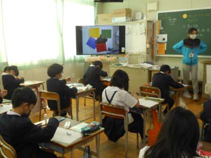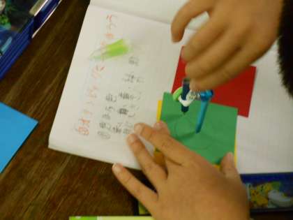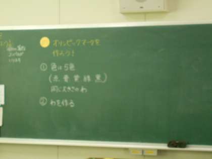 「オリンピックのマークを作ろう」というテーマで、5色の紙にコンパスを使って円を描いて切り抜きいろいろと組み合わせる活動に集中していました。
