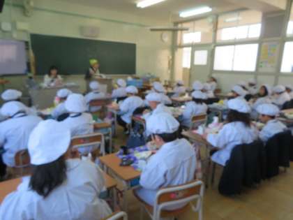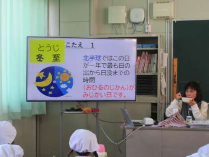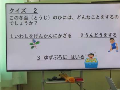 大型モニターに映した栄養教諭が作成した冬至についての資料を視聴しながら、落ち着いてしっかりと給食をいただいていました。