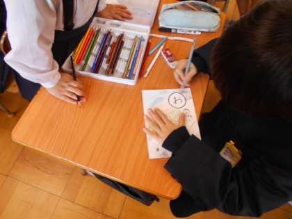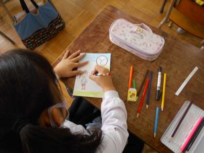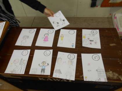 読み札は、各学年学級ごとにすでに考えられており、読み札に合わせて絵札づくりをたてわり班ごとに分担して作成しました。