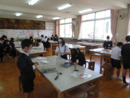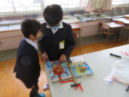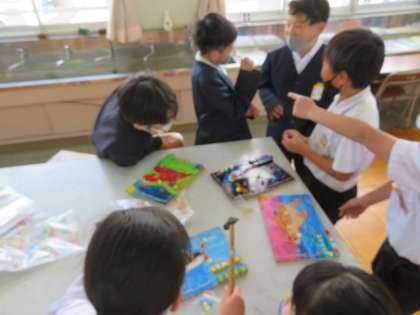 「くぎうちビー玉ゲーム」という教材で、台になる部分に絵を描いたり、くぎ打ちをしたりしてスマートボール型のゲームを完成させていました。