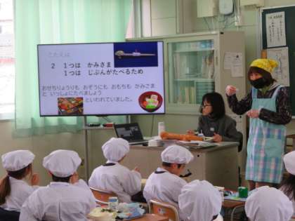 お正月にいただく、おせち料理や雑煮などについてわかりやすい指導をしていただきながら、正月行事献立を味わいながらいただいていました。